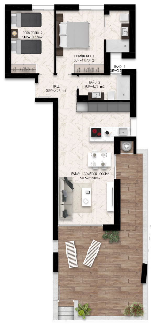 Kompleks mieszkaniowy „Lo Marabú Bungalows” składa się z 84 nowoczesnych bungalowów położonych w Lo Marabú, 10 minut od najlepszych plaż na Costa Blanca. Każdy bungalow oferuje dwie sypialnie i dwie łazienki, wszystkie na jednym poziomie. Parter oferuje duży taras, a piętro prywatne solarium.