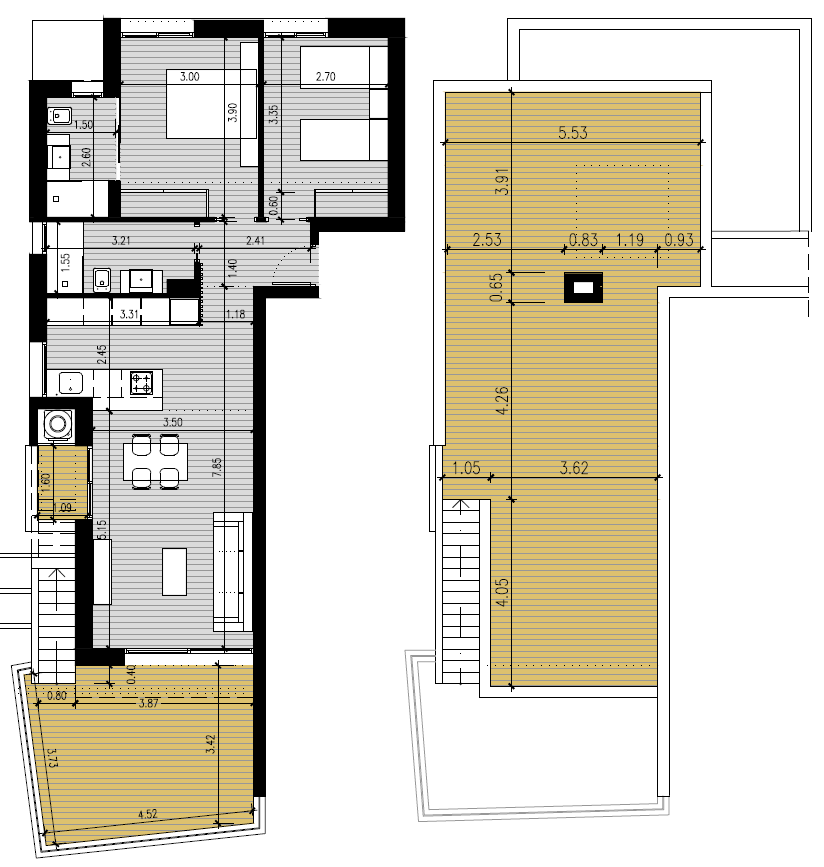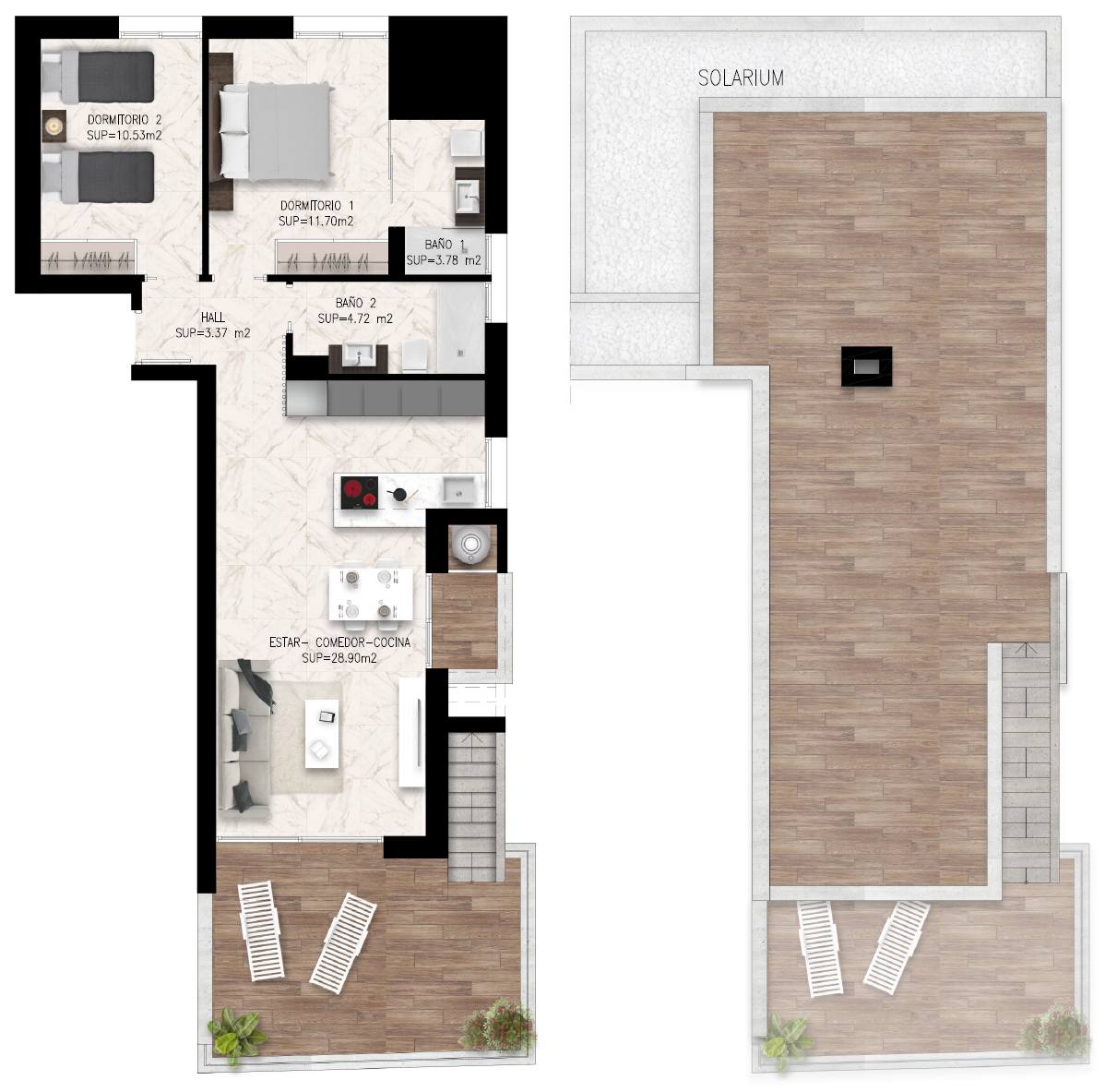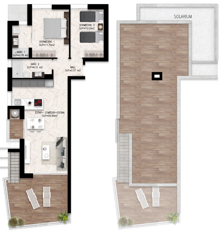 The “Lo Marabú Bungalows” residential complex comprises 84 modern bungalows located in Lo Marabú, 10 minutes from the best beaches on the Costa Blanca. Each bungalow features two bedrooms and two bathrooms, all on one level. The ground floor offers a large terrace, while the upper floor boasts a private solarium.