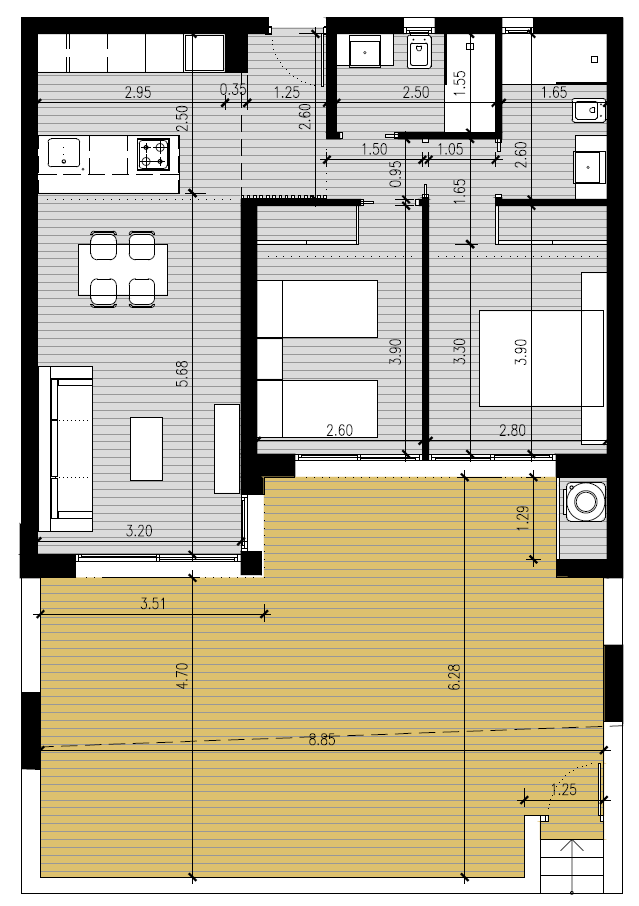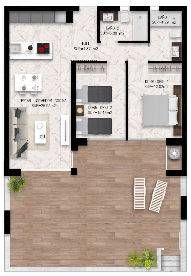 The “Lo Marabú Bungalows” residential complex comprises 84 modern bungalows located in Lo Marabú, 10 minutes from the best beaches on the Costa Blanca. Each bungalow features two bedrooms and two bathrooms, all on one level. The ground floor offers a large terrace, while the upper floor boasts a private solarium.