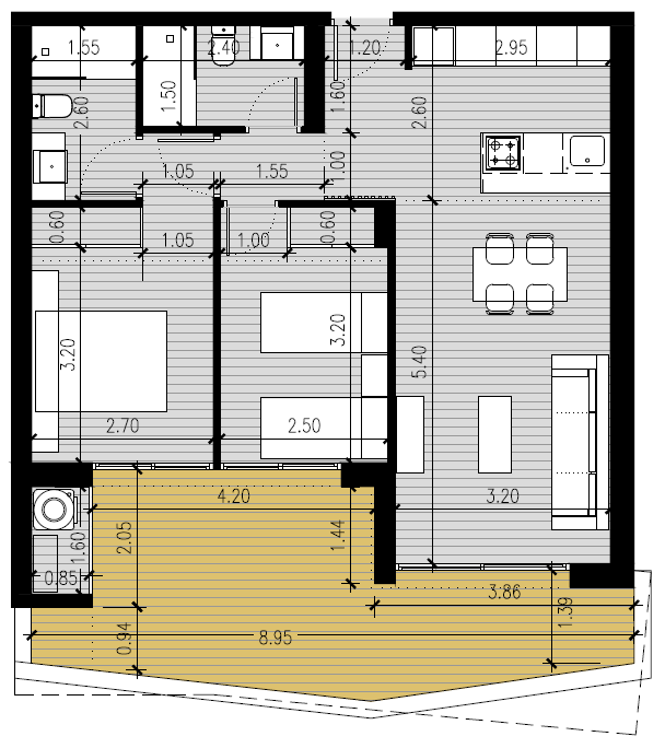 The residential complex consists of 112 with 2 bedroom and 2 bathroom apartments, distributed across a seven-story block with a modern and innovative style, located in San Miguel de Salinas, 8 km from the beaches of Orihuela Costa, Torrevieja and Guardamar.